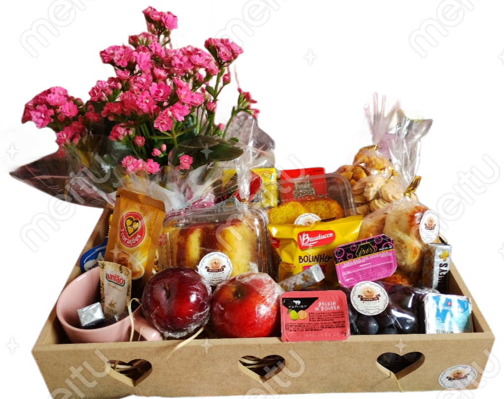 A Cesta Especial vai em uma bandeja ou caixote de madeira ou Mdf com aproximadamente 35cm, embalada em celofane e um lindo laço com os seguintes itens: biscoitos doce e salgado caseiros, torradas, bolo fresco, pães frescos, iogurte, suco, achocolatado, cappuccino, chá, manteiguinha, mel, geleinha, Polenguinho, bombons, 3 tipos de frutas frescas, um vaso de flor e uma linda xícara. Gentileza informar a cor preferida da embalagem no campo de mensagens (tons de rosa, azul ou coração vermelho).